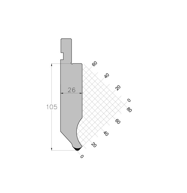 ES PUNCH 85° R3 H105 L835 mm – 011.231S. Lenght mm: 835. Height mm: 135. Useful Height mm: 105. Thickness mm: 26. Steel Type: C45 HARDENED 52-55HRC. Clamping: AMADA PUNCH. Tonnage: 100. Angle °: 85. Radius mm: 3.