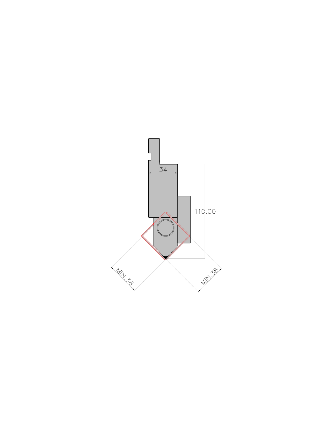 ROTARY PUNCH 85° R0.8 H110 L300 mm – 040.680.. Length mm: 450. Height mm: 140. Useful Height mm: 110. Steel Type: C45 HARDENED 52-55HRC. Clamping: AMADA PUNCH. Tonnage: 15. Angle °: 85. Radius mm: 0,8.